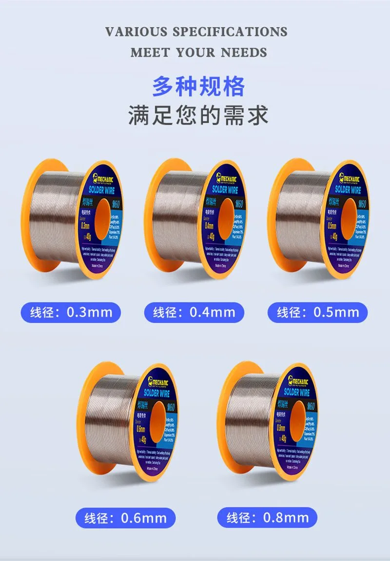 Reliable soldering connections. The solder wire comes in a 40g spool, providing sufficient material for multiple projects. It is designed to melt at an optimal temperature, ensuring effective bonding without damaging sensitive components. The MECHANIC M60 solder wire is known for its excellent flow and strong adhesion, making it an ideal choice for professionals and hobbyists alike. Trust this solder wire to deliver reliable soldering results every time.
