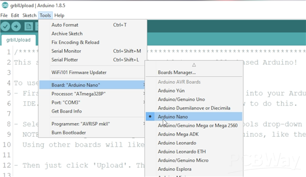 Then open the code named GRBL Upload from the examples section, you do not need to make any changes here, just upload the code by selecting the board and port.